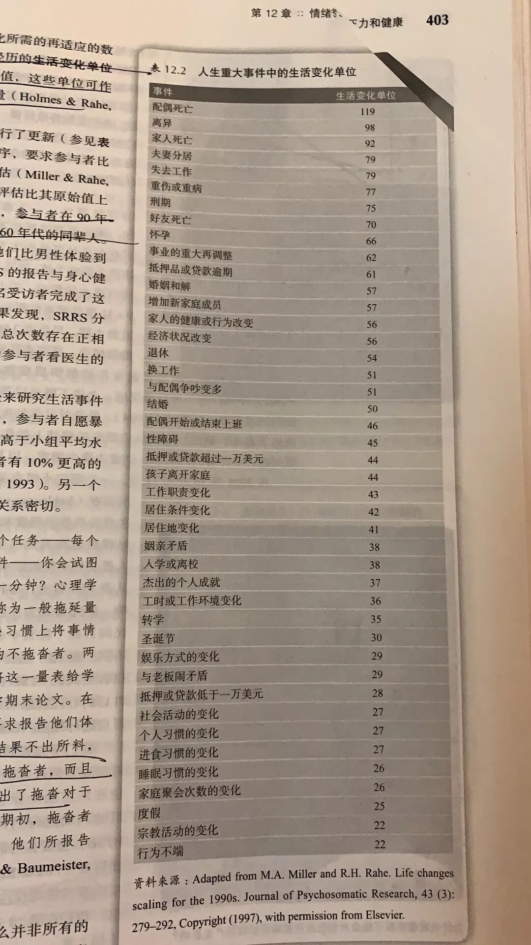 直到我看到书中这张“人生重大事件中的生活变化单位”表格,才更好地理解自己当时所经历的一系列事件给我带来的压力。(心疼地抱了抱自己)