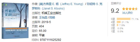 《性格的陷阱》一书作者是图式疗法创始人Jeffrey E. Young,他92年就写了这本书,也就是今年5月份才第一次有中文译本。所以豆瓣评分现在也比较少。