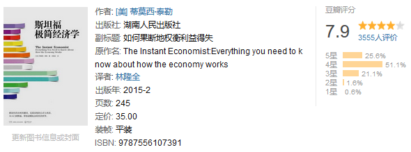 我比较推荐这本书的原因是:1)框架性强,这本书可以作为一本简易版的教材来看,笼统地介绍了宏观和微观经济学的一些基础知识,所以虽然我之前看过一些经济学相关的畅销书,但看了这本之后才有了一个大概的框架感,并且很欣喜地发现在看一些财经新闻时候知道什么是什么了;