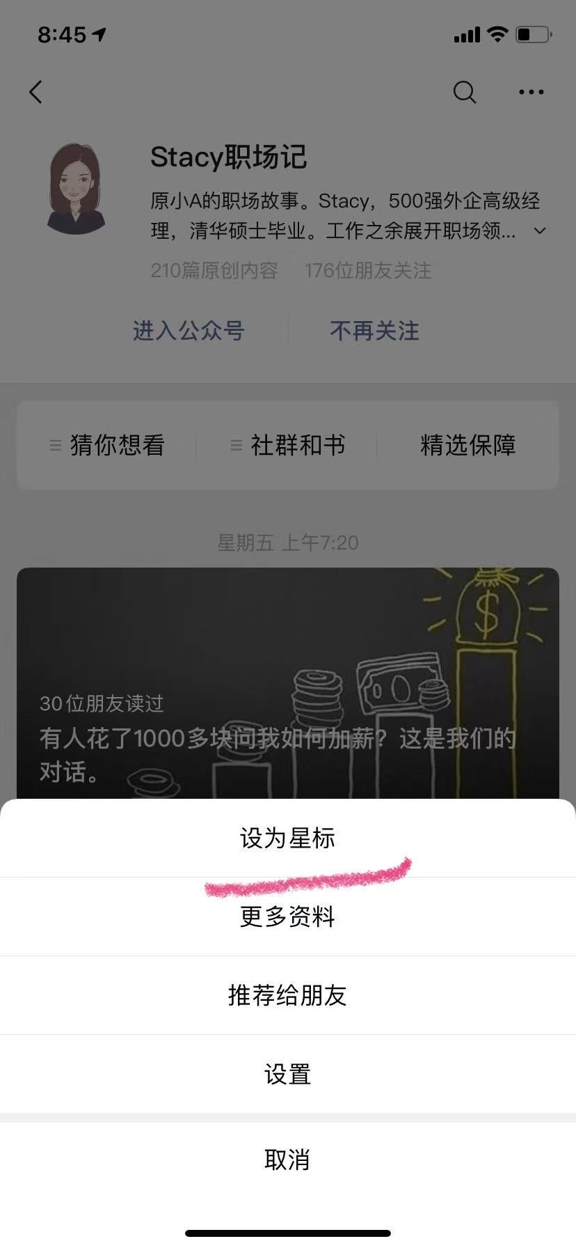 有读者反映收不到文章推送,可以在公众号把公众号“设为星标”试试。如下图: