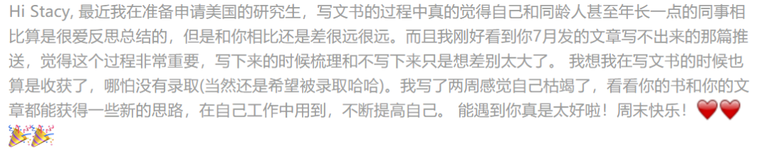 “Hi Stacy,最近我在准备申请美国的研究生,写文书的过程中真的觉得自己和同龄人甚至年长一点的同事相比算是很爱反思总结的,但是和你相比还是差很远很远。而且我刚好看到你7月发的文章写不出来的那篇推送,觉得这个过程非常重要,写下来的时候梳理和不写下来只是想差别太大了。我想我在写文书的时候也算是收获了,哪怕没有录取(当然还是希望被录取哈哈)。我写了两周感觉自己枯竭了,看看你的书和你的文章都能获得一些新的思路,在自己工作中用到,不断提高自己。能遇到你真是太好啦!周末快乐!️️”